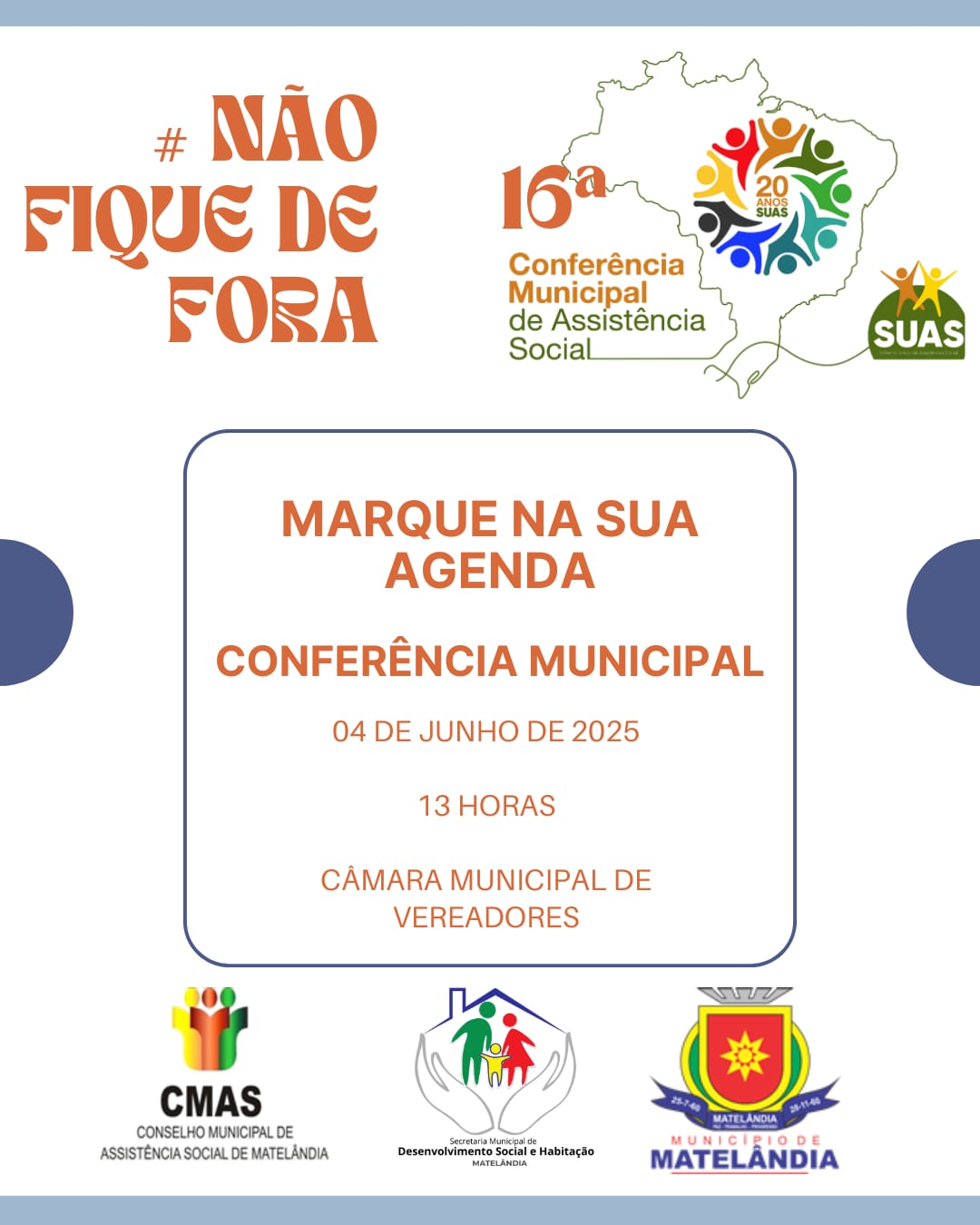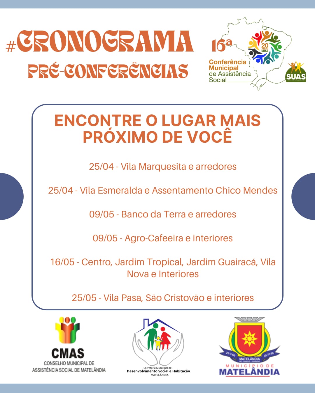REUNIÕES ORDINÁRIAS TODAS AS 3ª QUARTAS-FEIRAS DE CADA MÊS, AS 13:30 HORAS NA SALA DE REUNIÕES DO CRAS- CENTRO DE REFERÊNCIA DE ASSISTÊNCIA SOCIAL ( Rua Pedro Alvares Cabral, nº 338, Centro, Matelândia)