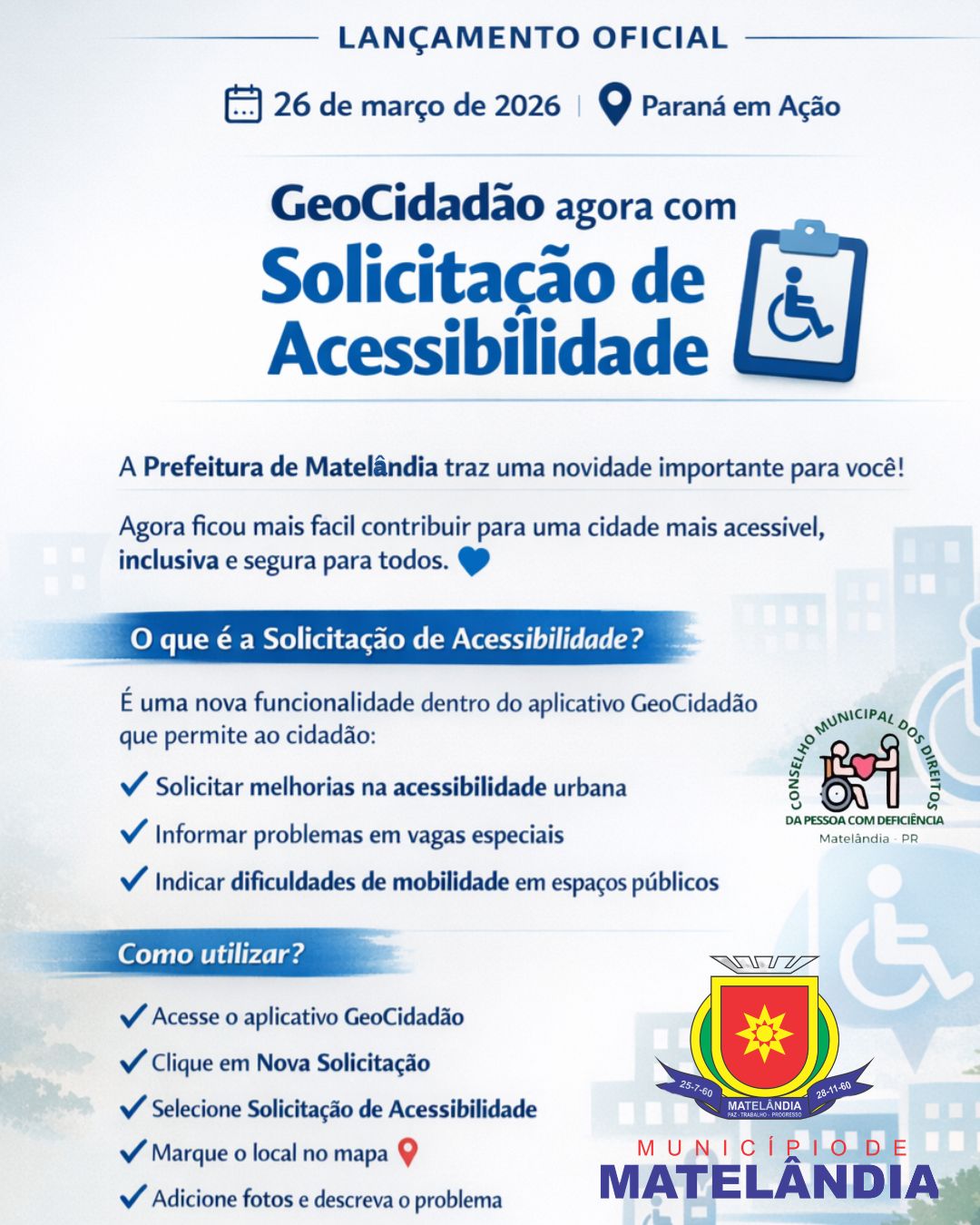 A Prefeitura de Matelândia apresenta uma nova funcionalidade para fortalecer a inclusão e melhorar a mobilidade urbana. Agora, pelo aplicativo GeoCidadão, o cidadão pode registrar solicitações relacionadas à acessibilidade de forma simples e rápida, contribuindo para uma cidade mais acessível e segura para todos.