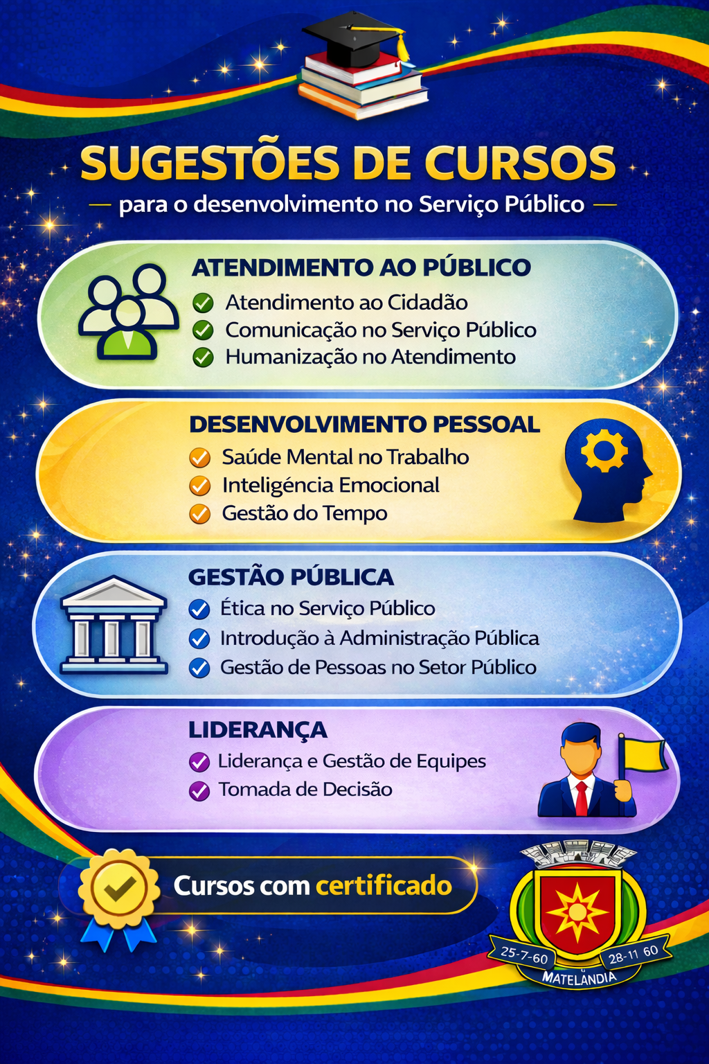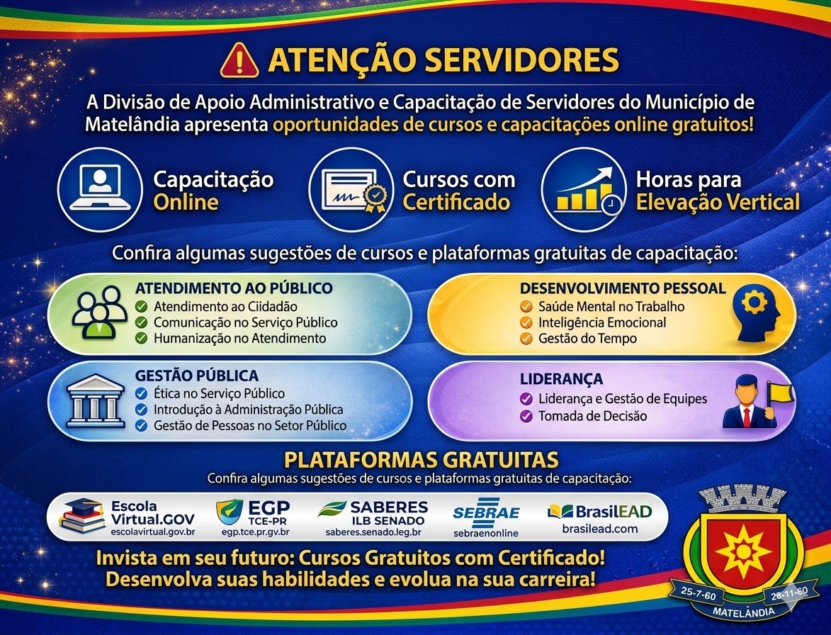 A Administração Municipal de Matelândia incentiva todos os servidores a buscarem constantemente conhecimento e qualificação profissional.Pensando nisso, selecionamos algumas plataformas com cursos gratuitos e com certificado, além de sugestões de capacitações que podem contribuir para o crescimento pessoal e profissional no serviço público.